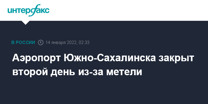 Москва. 14 января. INTERFAX.RU - Аэропорт Южно-Сахалинска остается закрытым в пятницу - пока до 15:00 по местному времени (07:00 по московскому времени) из-за сложных метеоусловий, сообщает пресс-служба воздушной гавани.