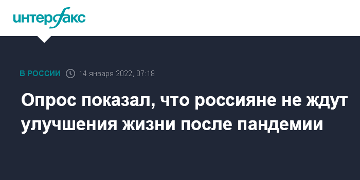 Москва. 14 января. INTERFAX.RU - Почти каждый второй россиянин (47%) уверен, что уровень жизни большинства жителей РФ после завершения пандемии COVID-19 никак не изменится, свидетельствуют данные опроса Фонда "Общественное мнение" (ФОМ), поступившие в "Интерфакс".
