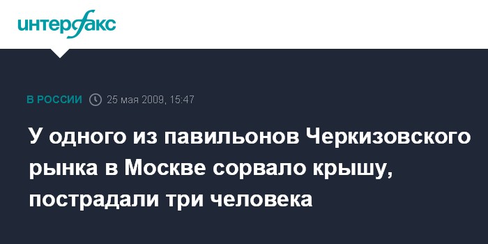 Москва. 25 мая. INTERFAX.RU - Порыв ветра сорвал днем в понедельник крышу одного из торговых павильонов на Черкизовском рынке в Москве, сообщил "Интерфаксу" источник в правоохранительных органах города.