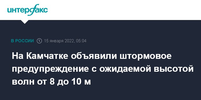Москва. 15 января. INTERFAX.RU - Штормовое предупреждение о высоких волнах в акваториях Берингова моря и Тихого океана объявили в Камчатском крае. Ожидаемая высота волн составит 8-10 м, сообщает пресс-служба регионального управления МЧС.