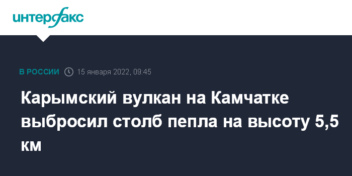 Москва. 15 января. INTERFAX.RU - Вулкан Карымский на Камчатке в субботу выбросил столб пепла на высоту около 5,5 км над уровнем моря, сообщает пресс-служба ГУ МЧС региона со ссылкой на Камчатскую группу реагирования на вулканические извержения института вулканологии и сейсмологии Дальневосточного отделения РАН.