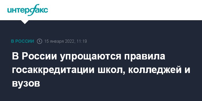 Москва. 15 января. INTERFAX.RU - С 1 марта 2022 года процедура прохождения государственной регистрации (аккредитации) для школ, колледжей и вузов будет упрощена, что должно снизить административную нагрузку на образовательные организации и позволит им не отвлекаться от своей основной работы.