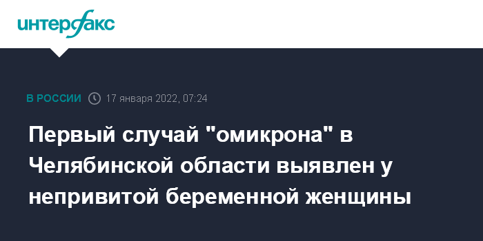 Москва. 17 января. INTERFAX.RU - Первый случай заражения штаммом "омикрон" зарегистрировали в Челябинской области, его выявили у беременной женщины, сообщила первый вице-губернатор Ирина Гехт в эфире радио "Комсомольская правда" в понедельник.