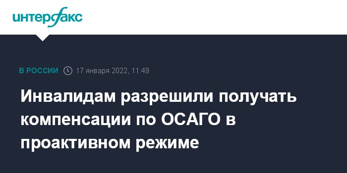 Москва. 17 января. INTERFAX.RU - Премьер-министр Михаил Мишустин сообщил, что подписал постановление правительства, позволяющее с 2022 года инвалидам получать компенсации по ОСАГО в проактивном режиме.