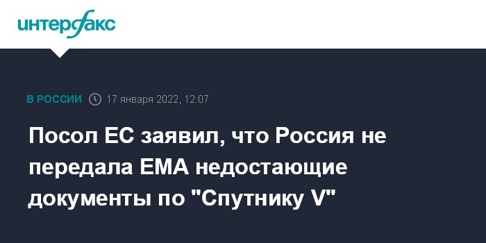 Москва. 17 января. INTERFAX.RU - Россия не передала Европейскому агентству по лекарственным средствам (EMA) недостающие документы для признания вакцины "Спутник V" от COVID-19 в ЕС, Брюссель надеется, что это будет сделано по аналогии с ВОЗ, заявил посол Евросоюза в Москве Маркус Эдерер.