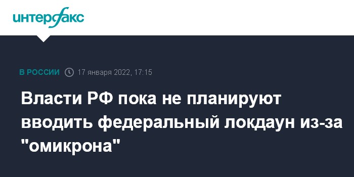 Москва. 17 января. INTERFAX.RU - Власти РФ пока не рассматривают вариант введения локдауна из-за роста заболеваемости коронавирусом, вызванного штаммом "омикрон", ограничения возможны на региональном уровне в случае роста госпитализаций, сообщили "Интерфаксу" информированные источники.