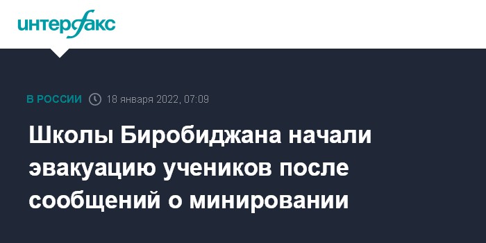 Москва. 18 января. INTERFAX.RU - Сообщения о минировании поступили в образовательные учреждения столицы Еврейской автономной области Биробиджана, учеников эвакуируют, сообщает пресс-служба городской администрации на своей странице в социальной сети.