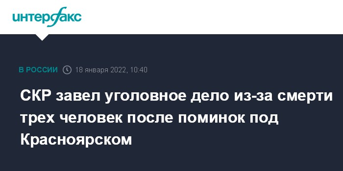 Москва. 18 января. INTERFAX.RU - Смерть трех человек после поминок в селе Тасеево Красноярского края расследуют в рамках уголовного дела, сообщает во вторник пресс-служба главного следственного управления СКР по региону и Республике Хакасия.