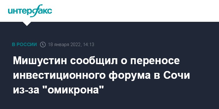 Москва. 18 января. INTERFAX.RU - Планировавшийся в феврале в Сочи Российский инвестиционный форум из-за распространения штамма "омикрон" перенесен на более поздний срок, заявил премьер РФ Михаил Мишустин.