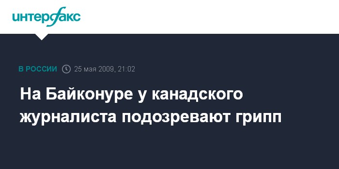 Байконур. 25 мая. INTERFAX.RU - На Байконуре госпитализирован в понедельник с симптомами гриппа канадский журналист, прибывший накануне на космодром наблюдать за запуском пилотируемого космического корабля "Союз-ФГ".