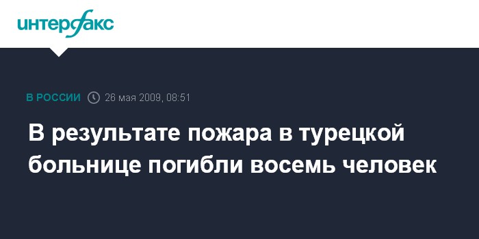 Москва. 26 мая. INTERFAX.RU - В турецкой провинции Бурса в больнице города Шевкет Йылмаз произошел пожар, в результате которого погибли восемь человек, сообщает во вторник турецкая газета "Хюрриет".