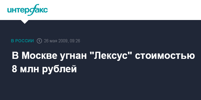 Москва. 26 мая. INTERFAX.RU - В понедельник утром на западе столицы похитили автомобиль "Лексус LS600", владелец оценил материальный ущерб в 8 млн рублей, сообщил во вторник "Интерфаксу" источник в правоохранительных органах города.