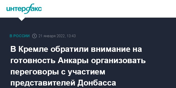 Москва. 21 января. INTERFAX.RU - Россия не получала от Турции официальных предложений по посредничеству в урегулировании украинского кризиса, но обратила внимание на заявление Анкары о готовности пригласить представителей Донбасса на такую встречу, заявил пресс-секретарь президента РФ Дмитрий Песков.