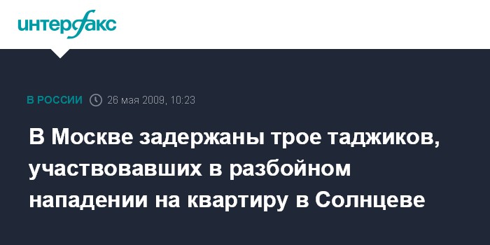 Москва. 26 мая. INTERFAX.RU - На западе Москвы задержаны трое граждан Таджикистана, которые 6 апреля совершили разбойное нападение на квартиру в Солнцеве и ранили сотрудников милиции, сообщил "Интерфаксу" источник в правоохранительных органах города во вторник.