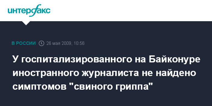 "Иностранный журналист, прилетевший на Байконур наблюдать за запуском пилотируемого корабля, с признаками ОРЗ накануне был помещен в медико-биологический центр. Анализы показали, что симптомов гриппа A/H1N1 у него не наблюдается. Завтра журналист будет выписан из госпиталя и сможет присутствовать на старте", - сообщил "Интерфаксу-АВН" источник на космодроме.