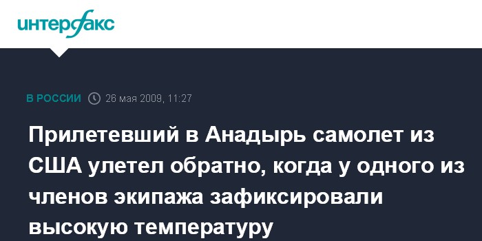 Москва. 26 мая. INTERFAX.RU - Американский самолет с несколькими пассажирами, прилетевший на Чукотку, улетел обратно в США после того, как у члена экипажа российские медики обнаружили высокую температуру, сообщил во вторник "Интерфаксу" руководитель Роспотребнадзора, главный государственный санитарный врач РФ Геннадий Онищенко. Он добавил, что людям, которые находились на борту, было предложено пройти обследование. Но они, не выходя из самолета, приняли решение улететь обратно в США.