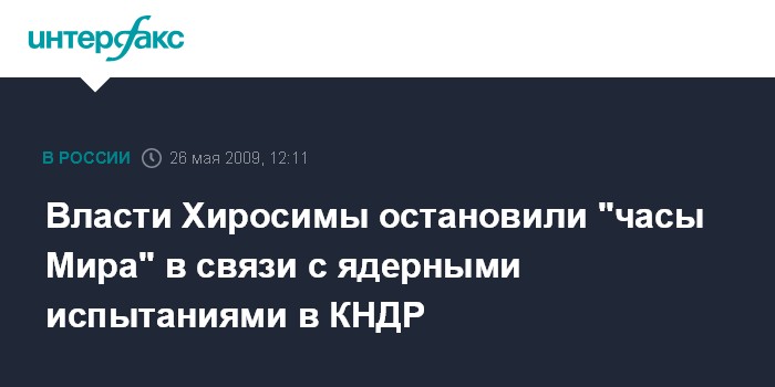 Москва. 26 мая. INTERFAX.RU - Власти японского города Хиросимы остановили во вторник "часы Мира" в связи с ядерными испытаниями, проведенными КНДР накануне, сообщило японское агентство "Киодо".