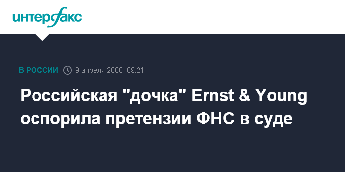 Москва. 9 апреля. INTERFAX.RU - Федеральная налоговая служба РФ предъявила претензии российской "дочке" одной из крупнейших в мире аудиторско-консалтинговых компаний Ernst & Young - ЗАО "Эрнст энд Янг Внешаудит".