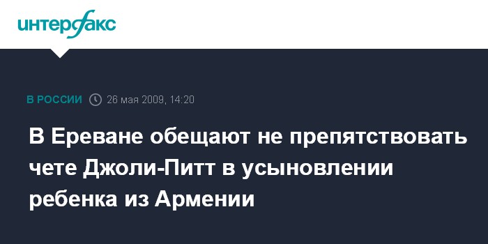 Ереван. 26 мая. INTERFAX.RU - Государственные органы Армении пока не получали официального запроса от известных американских актеров - супругов Анджелины Джоли и Брэда Питта - о возможности усыновить армянского ребенка.