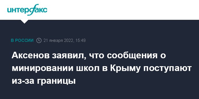 Москва. 21 января. INTERFAX.RU - Учебные заведения как минимум трех муниципалитетов Крыма получают в пятницу информацию о минировании, ее отправители находятся за границей, сообщил глава республики Сергей Аксенов.
