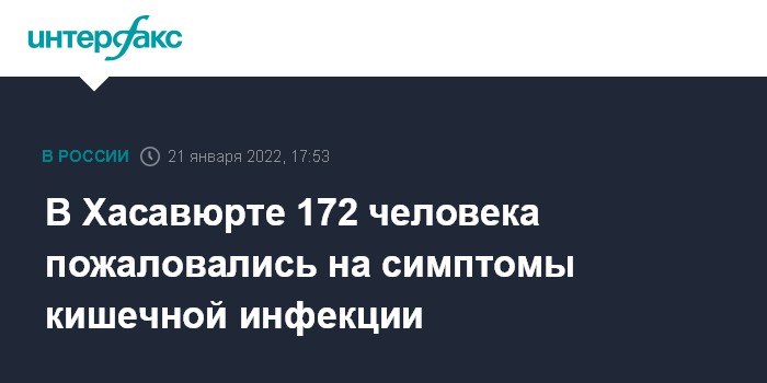 Москва. 21 января. INTERFAX.RU - В Хасавюрте к врачам с симптомами острой кишечной инфекции обратились уже 172 человека, в том числе 160 детей, сообщили в Минздраве Дагестана. Пациенты с такими жалобами начали поступать в городскую больницу с 1 января.