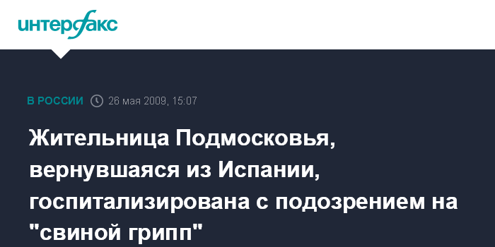 Красногорск (Подмосковье). 26 мая. INTERFAX.RU - Жительница Московской области, вернувшаяся из поездки в Испанию, госпитализирована во вторник с подозрением на заболевание "свиным гриппом".