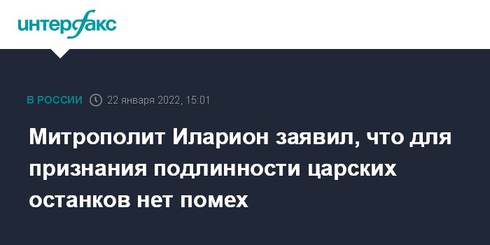 "На мой взгляд, ничего сегодня не мешает признанию подлинности "екатеринбургских останков", но для того, чтобы они были признаны подлинными, нужно соборное решение церкви", - заявил глава синодального Отдела внешних церковных связей митрополит Иларион в эфире программы "Церковь и мир" на телеканале "Россия-24".