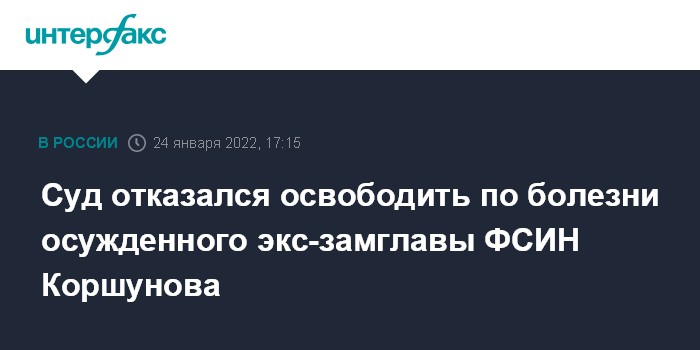 При этом, указывается в сообщении на сайте юридической фирмы "Линников и партнеры", медицинская комиссия ФСИН в январе 2022 года, подтвердив сам диагноз, "цинично и необоснованно" заявила о "мнимом улучшении" состояния Коршунова, придя к выводу, что у него сейчас нет заболеваний, препятствующих отбыванию им наказания.