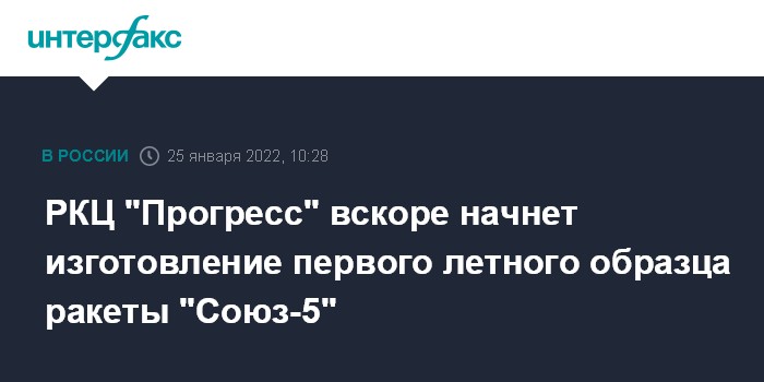 Москва. 25 января. INTERFAX.RU - Самарский РКЦ "Прогресс" в ближайшее время приступит к изготовлению первого летного образца перспективной ракеты-носителя "Союз-5", сообщил журналистам гендиректор центра Дмитрий Баранов.
