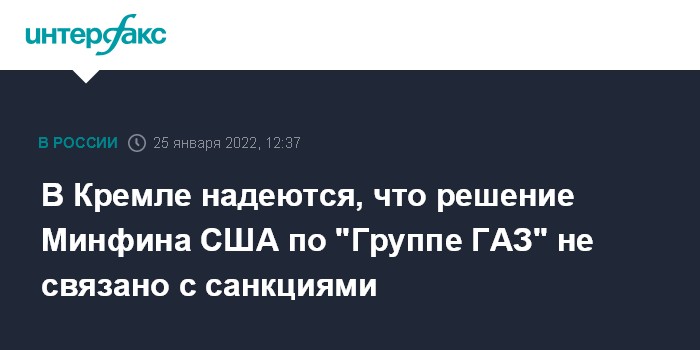 Москва. 25 января. INTERFAX.RU - В Кремле рассчитывают, что сокращение Минфином США срока действия лицензии "Группы ГАЗ" не связано с вопросом о санкциях, заявил пресс-секретарь президента РФ Дмитрий Песков.