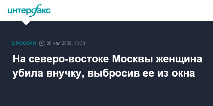 Москва. 26 мая. INTERFAX.RU - В Москве в Северо-Восточном административном округе на ул. Декабристов 54-летняя женщина убила полуторагодовалую внучку, а затем сама свела счеты с жизнью.