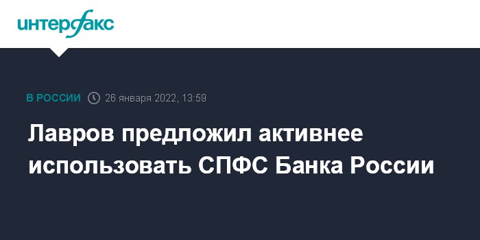 Москва. 26 января. INTERFAX.RU - Глава МИД Сергей Лавров назвал надежной Систему передачи финансовых сообщений (СПФС), созданную Банком России, и призвал активнее ее использовать. Он также сообщил о сокращении резервов России в долларах и стремлении снизить зависимость экономики от американской валюты.