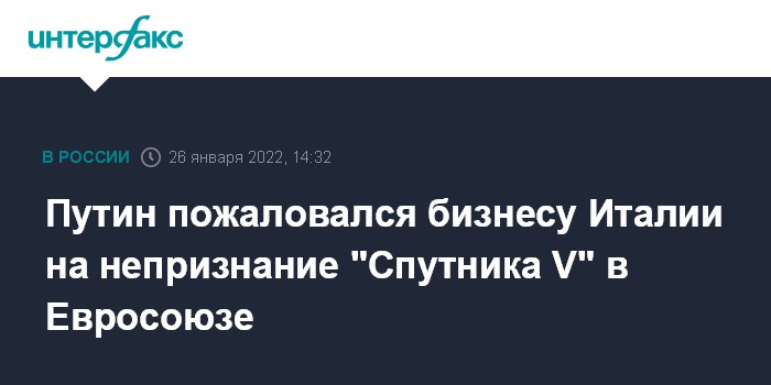 Москва. 26 января. INTERFAX.RU - Затягивание процесса взаимного признания вакцин против коронавируса между Россией и ЕС не способствует развитию российско-итальянских бизнес-контактов, заявил президент Владимир Путин на видеоконференции с топ-менеджерами крупнейших итальянских компаний.