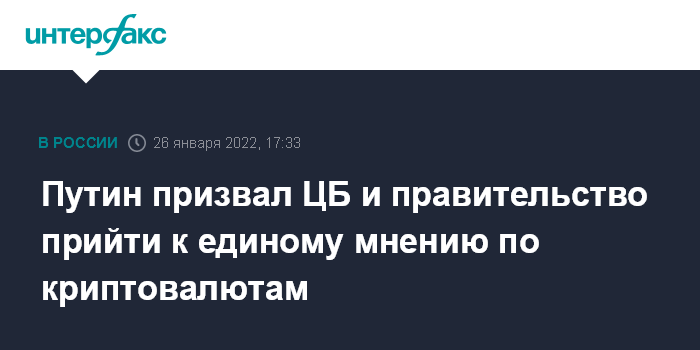 Москва. 26 января. INTERFAX.RU - Президент России Владимир Путин открыл традиционное совещание с членами правительства темой регулирования криптовалют, обращение и майнинг которых в России предложил запретить ЦБ РФ, при этом не сформулировал собственного отношения к этому вопросу.
