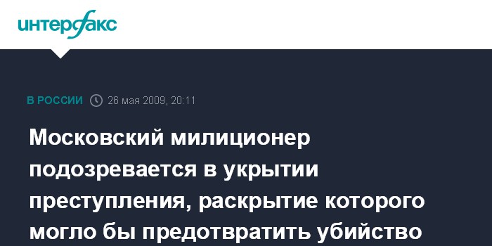 Москва. 26 мая. INTERFX.RU - В Москве возбуждено уголовное дело против сотрудника ОВД "Отрадное", укрывшего в феврале 2008 г. тяжкое преступление, своевременное раскрытие которого могло бы предотвратить нападение через несколько месяцев на инкассаторов с жертвами.