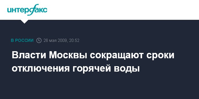 Москва. 26 мая. INTERFAX.RU - В 2009 г. впервые в весенне-летний сезон горячую воду в жилых домах Москвы отключают на две, а не на три недели, заявил первый заместитель мэра в правительстве Москвы Юрий Росляк.