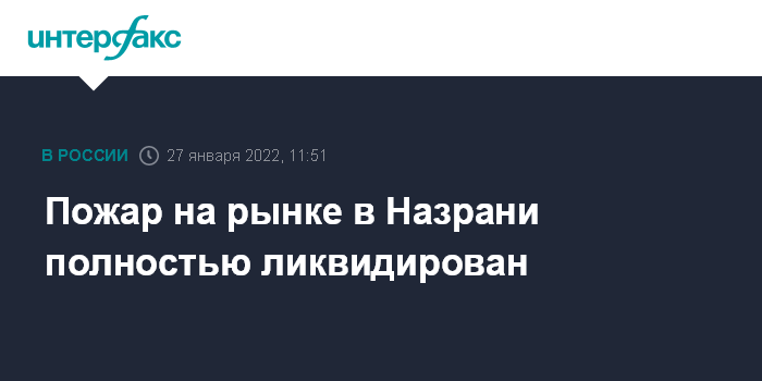 Москва. 27 января. INTERFAX.RU - Пожарные полностью ликвидировали возгорание на городском рынке в центре Назрани, сообщили "Интерфаксу" в ГУ МЧС по Ингушетии в четверг.