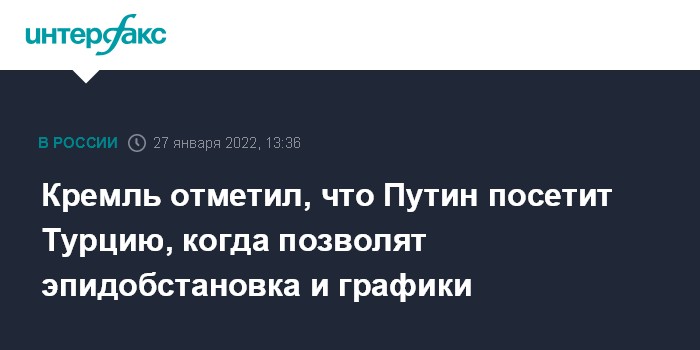 Москва. 27 января. INTERFAX.RU - Президент РФ Владимир Путин воспользуется приглашением своего турецкого коллеги Реджепа Эрдогана и приедет в Турцию, когда позволит эпидемиологическая обстановка и график, заявил пресс-секретарь президента РФ Дмитрий Песков.
