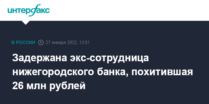 Москва. 27 января. INTERFAX.RU - Бывшая служащая банка Нижнего Новгорода, похитившая крупную сумму, задержана, сообщил "Интерфаксу" информированный источник в четверг.
