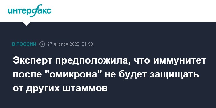 Москва. 27 января. INTERFAX.RU - Иммунитет, который будет формироваться после перенесенного заболевания "омикрон"-штаммом коронавируса, скорее всего, не будет защищать от других штаммов COVID-19, особенно тех, которые могут появиться в будущем, заявила замдиректора Московского научно-исследовательского института эпидемиологии и микробиологии имени Габричевского Роспотребнадзора Татьяна Руженцова.