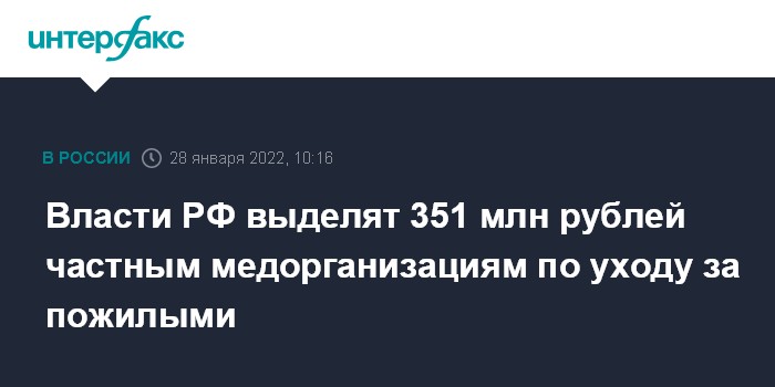 Власти РФ выделят 351 млн рублей частным медорганизациям по уходу за пожилыми