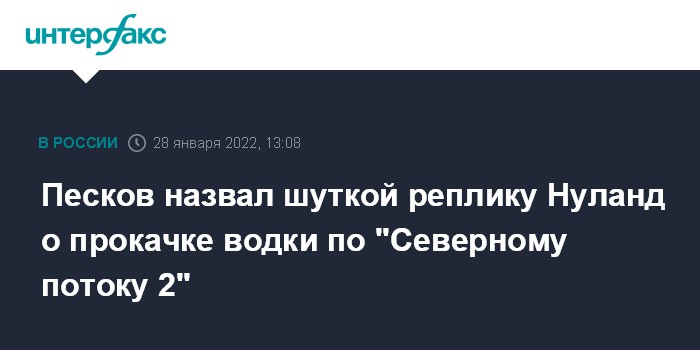 Москва. 28 января. INTERFAX.RU - В Кремле уверены, что реплика заместителя госсекретаря США Виктории Нуланд, связанная с поставками водки по газопроводу "Северный поток 2", была шуткой.