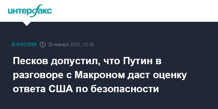 Песков допустил, что Путин в разговоре с Макроном даст оценку ответа США по безопасности