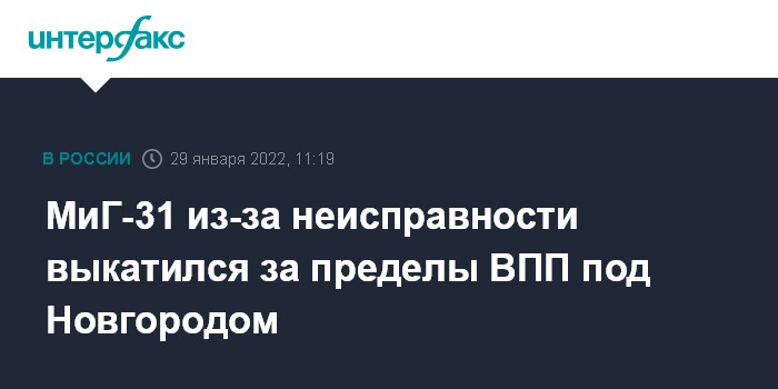 "29 января в Новгородской области во время взлета для совершения планового полета, в результате технической неисправности самолет МиГ-31, выкатился за пределы взлетно-посадочной полосы. Экипаж не пострадал. Жертв и разрушений на земле нет", - заявили в ведомстве.