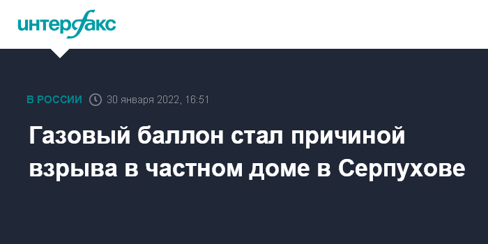 Москва. 30 января. INTERFAX.RU - Причиной взрыва в частном доме в Серпухове, в результате которого пострадали три человека, предварительно, стал газовый баллон, сообщили в воскресенье в пресс-службе министерства энергетики Московской области.