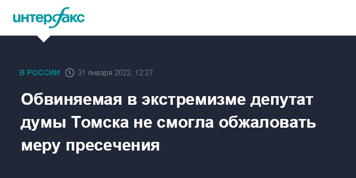 Москва. 31 января. INTERFAX.RU - Томский областной суд оставил в силе меру пресечения в виде запрета определенных действий депутату гордумы Томска Ксении Фадеевой (внесена Росфинмониторингом в реестр лиц, в отношении которых имеются сведения о причастности к терроризму или экстремизму). Об этом сообщается в телеграм-канале ее защиты.