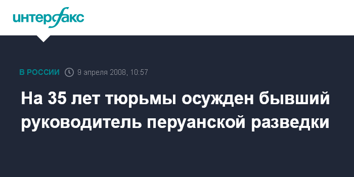 Лима. 9 апреля. INTERFAX.RU - Бывший руководитель Национального разведывательного управления Перу Хулио Саласар Монро приговорен перуанским правосудием к 35 годам тюремного заключения, сообщает в среду перуанская газета "Комерсио".
