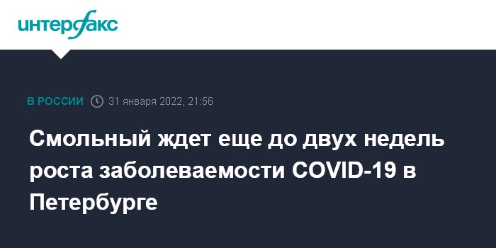 Москва. 31 января. INTERFAX.RU - В администрации Петербурга ожидают еще одну-две недели роста заболеваемости коронавирусной инфекцией в городе, заявил телеканалу "Санкт-Петербург" первый заместитель председателя городского комитета по здравоохранению Андрей Сарана.