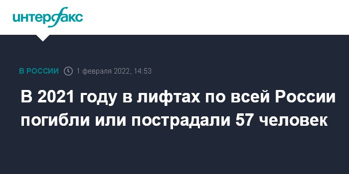 Москва. 1 февраля. INTERFAX.RU - В России в 2021 году в авариях с лифтами пострадали или погибли 57 человек, которые либо ехали в лифте, либо его чинили, сообщил на круглом столе по вопросам безопасности подъемников гендиректор АДС "СО "Лифтсервис"" Алексей Захаров.