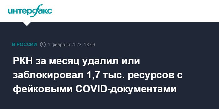 РКН за месяц удалил или заблокировал 1,7 тыс. ресурсов с фейковыми COVID-документами
